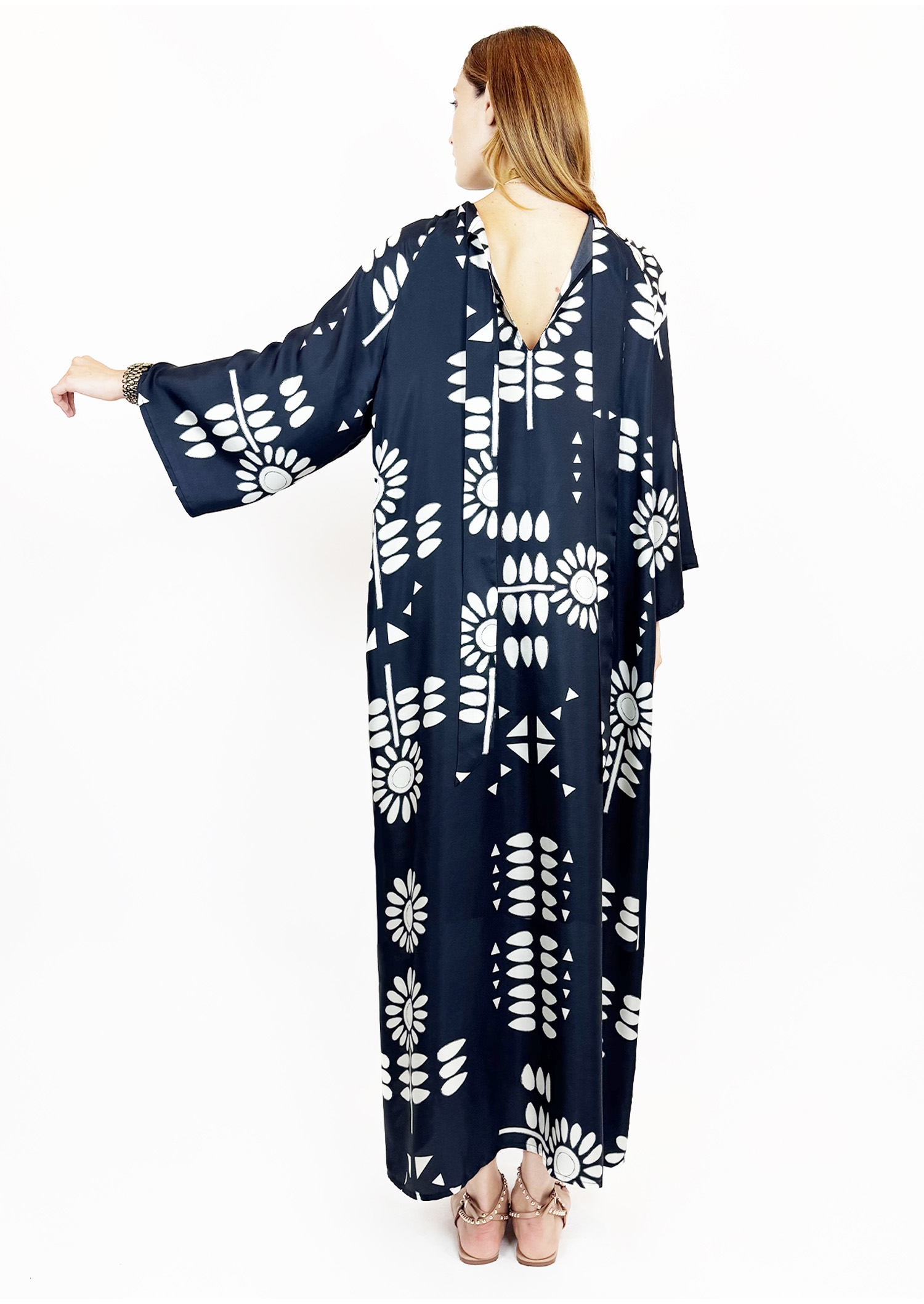 - Encolure col V et lien en soie tour de col